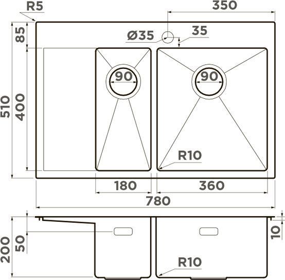 Пример: Внешний размер мойки - 800х500 мм. Размер отверстия под данную мойку 780х480 мм.