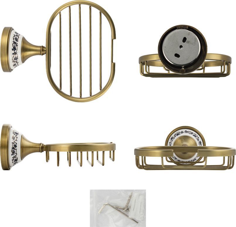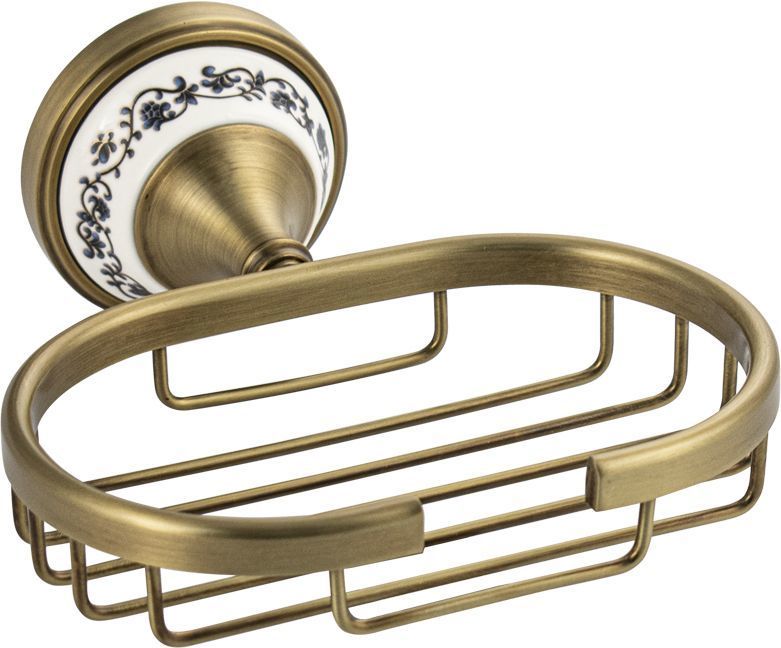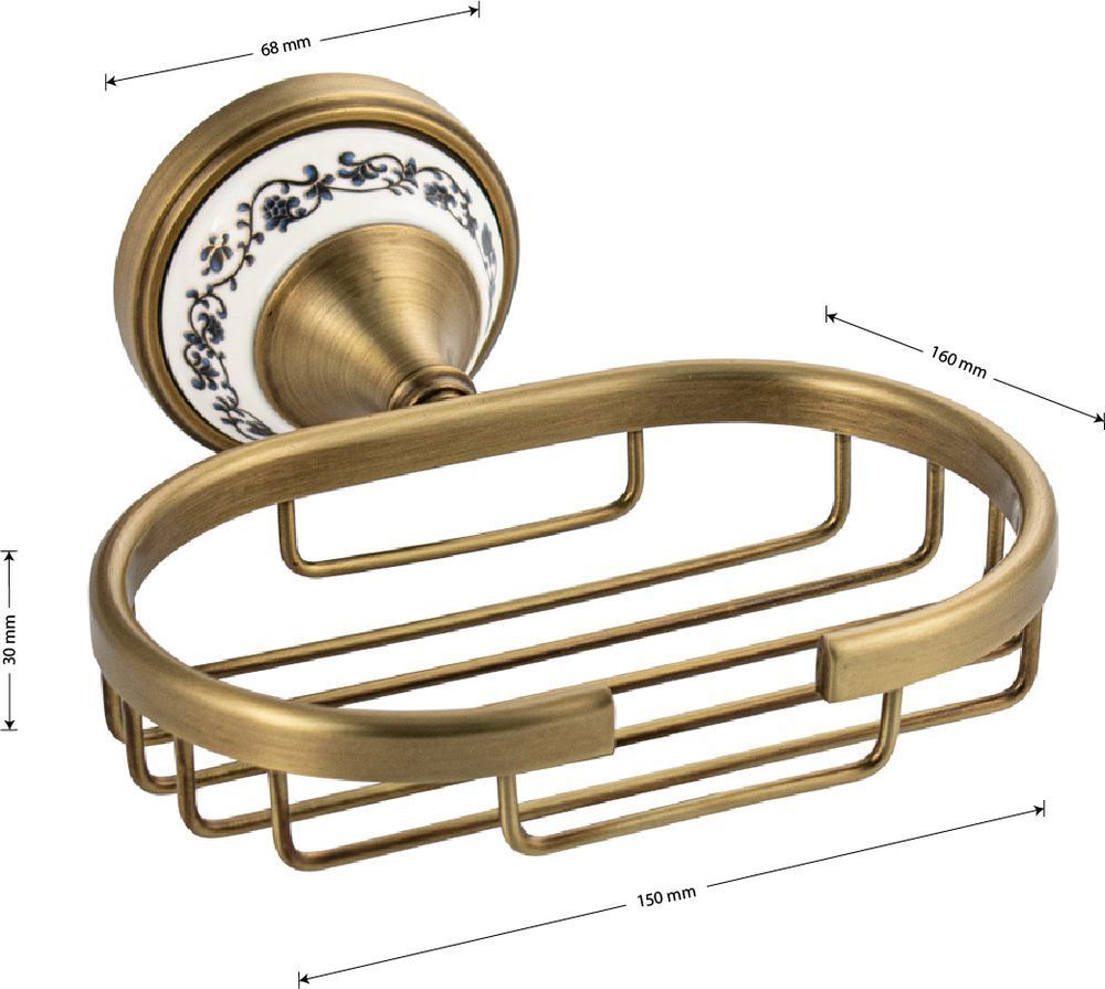 Мыльница подвесная, настенная, овальной формы, на основании, решетка, с керамической вставкой с орнаментом. Материал изготовления — ЦАМ. Имеет специальное бронзовое, матовое покрытие, которое защищает изделие от влаги и придает ему безупречный стильный вид и долговечность. Сетчатый каркас не позволяет влаге скапливаться, поэтому мыло долгое время сохраняет свою форму. Идеально подойдет не только для ванной, но и для кухни. Изделие крепится к стене с помощью дюбелей и саморезов (входят в комплект). Габаритные размеры: ширина150 мм, высота мыльницы 30 мм, глубина 160 мм, основание 68 мм. Вес - 0,50 кг, объём - 0,003 м3.