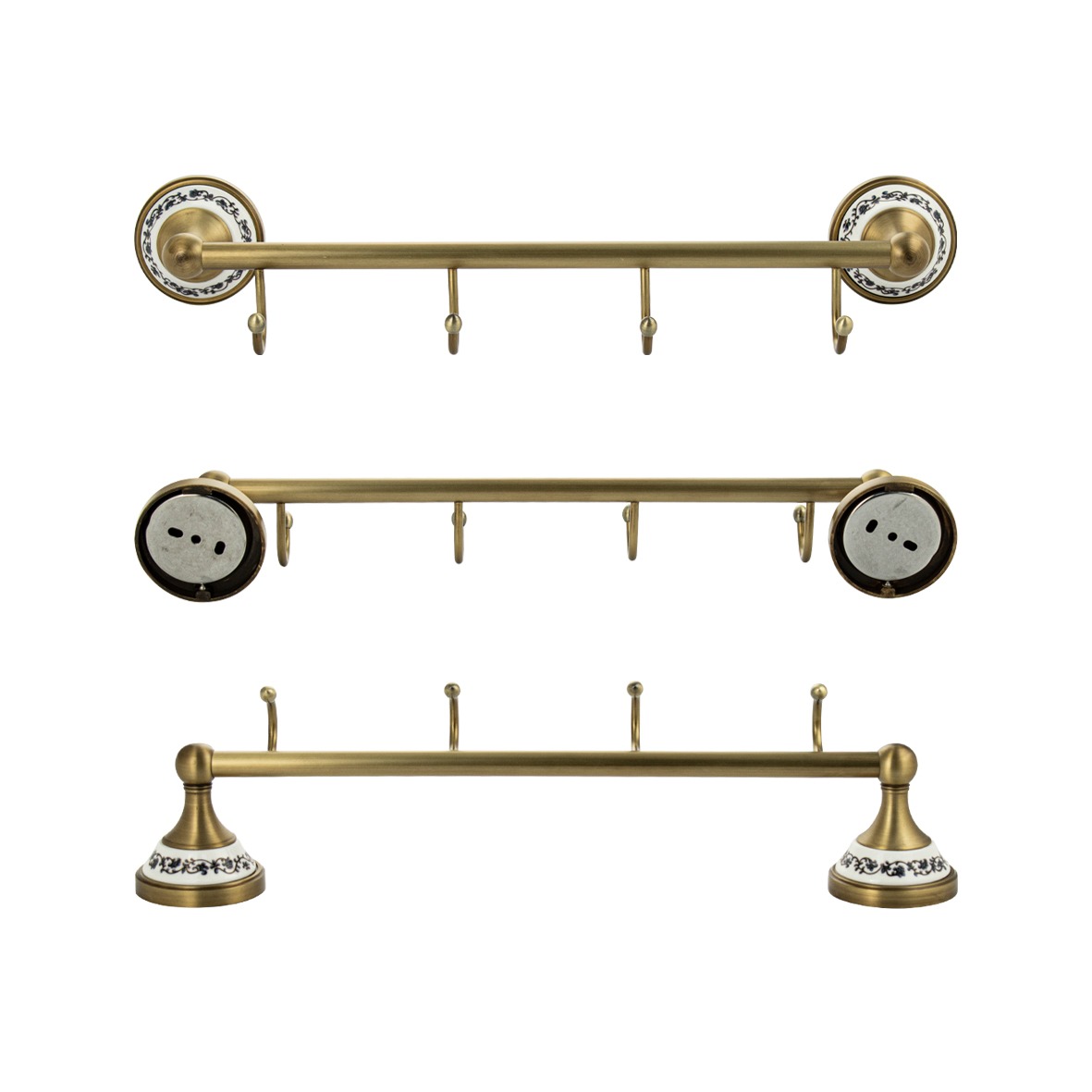 Держатель для полотенец металлический, с четырьмя крючками,с керамической вставкой с орнаментом. Материал изготовления — ЦАМ. Бронзовое, матовое покрытие очень стойко переносит истирания и обеспечивает безупречный стильный вид изделия и долговечность. На держателе с легкостью можно размещать вещи для сушки или вешать, как полотенца, так и одежду перед походом в душ. Идеально подойдет не только для ванной, но и для кухни, а также для дачи или гаража - при необходимости на держатель можно вешать любые предметы. Изделие крепится к стене с помощью дюбелей и саморезов (входят в комплект). Габаритные размеры: длина 435 мм, высота 80 мм, глубина 105 мм, основание 68 мм. Вес - 0,74 кг, объём - 0,005 м3
