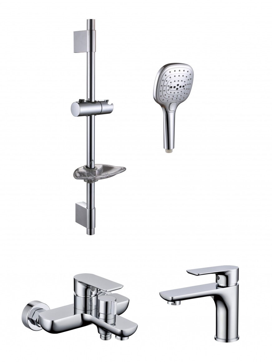 Набор смесителей 3 в 1 для ванны с коротким изливом Grocenberg GB1009CR: смеситель для раковины + смеситель для ванны + душевой гарнитур, материал латунь, цвет хром.