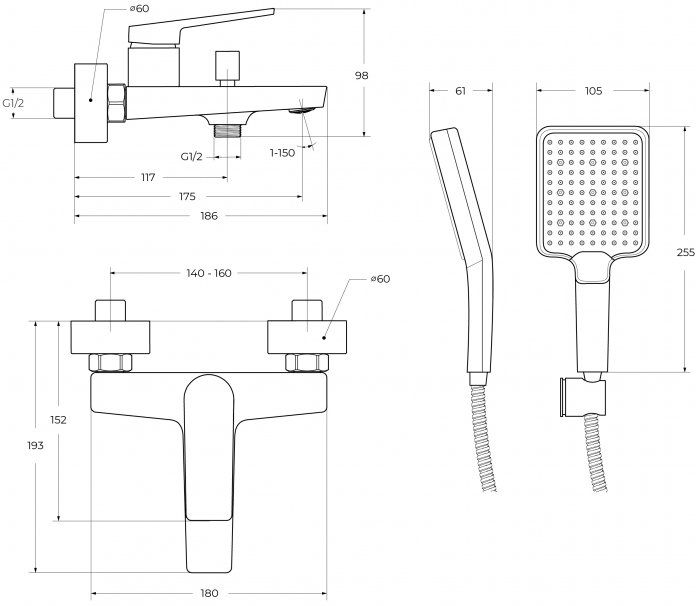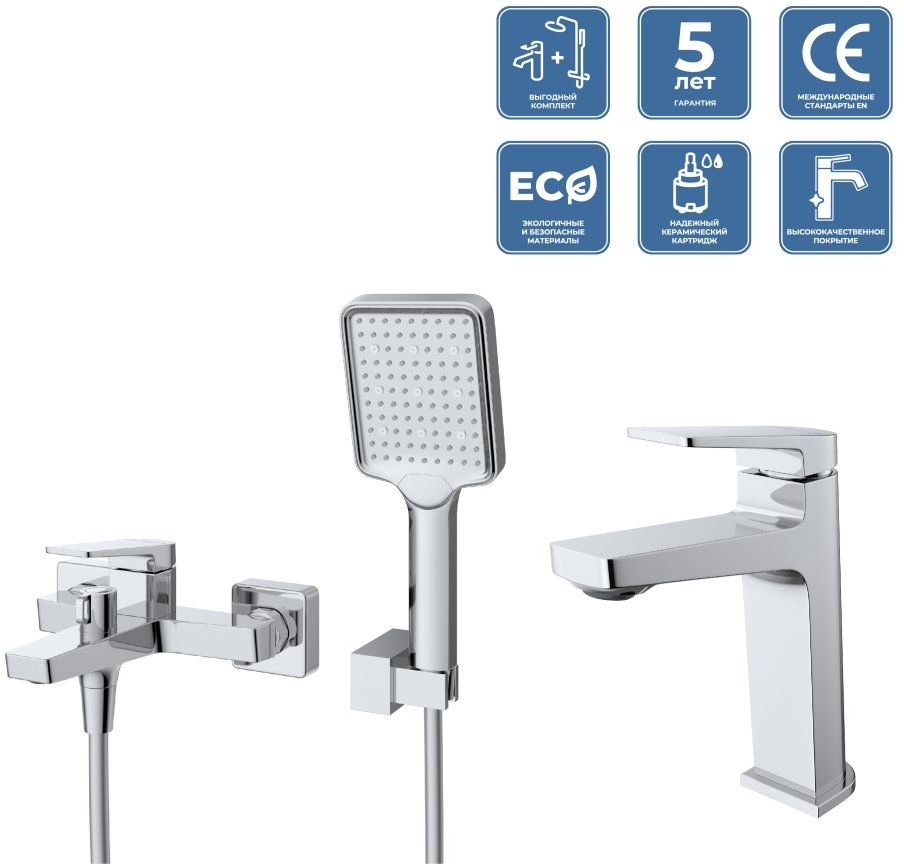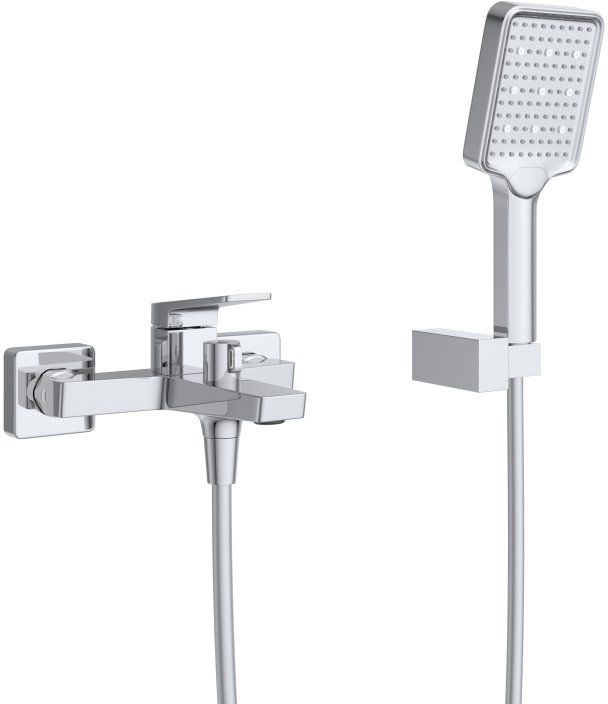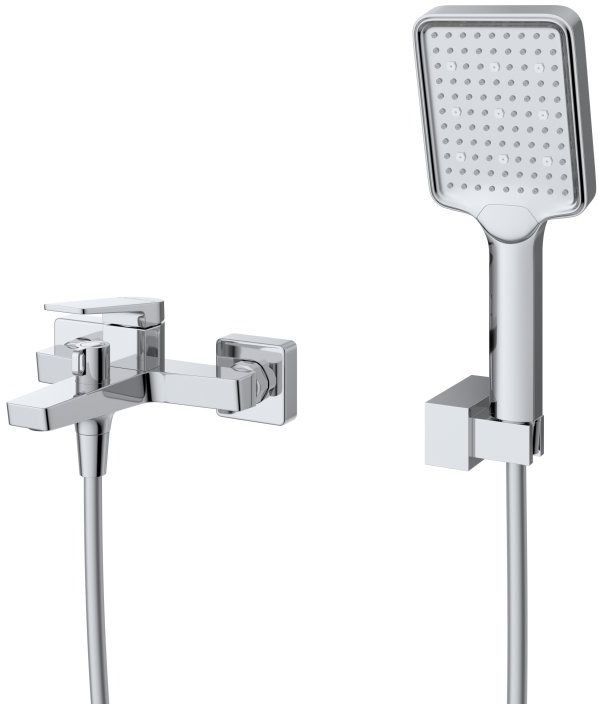 - Оснащение: душевой шланг ПВХ, ручной душ, настенный держатель ручного душа, смеситель