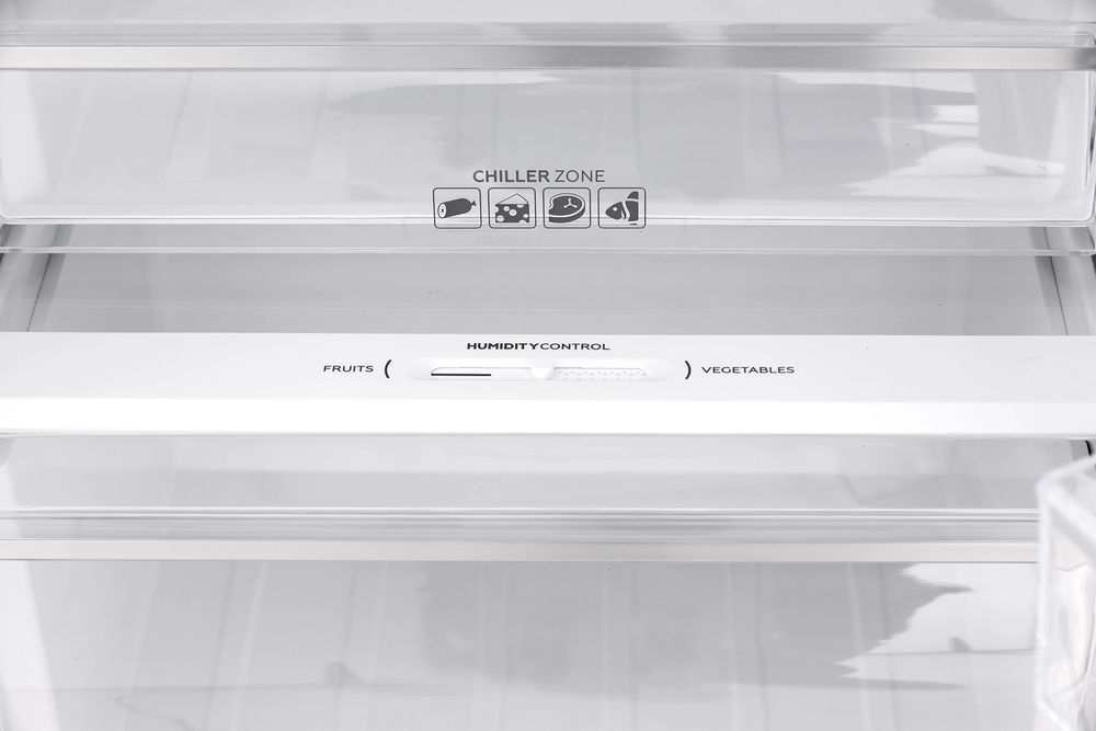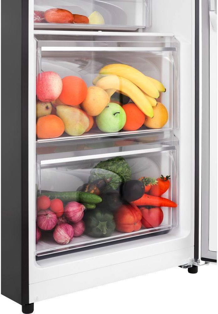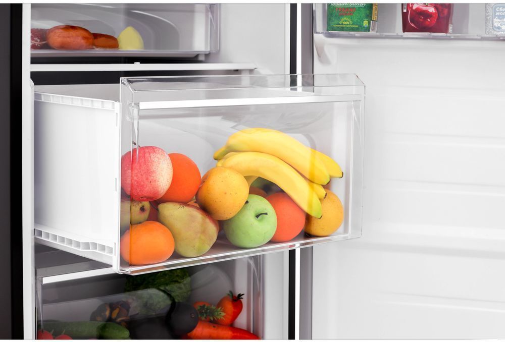 - 3 выдвижных ящика, где верхний ящик зоны свежести, а средний ящик с регулировкой уровня влажности