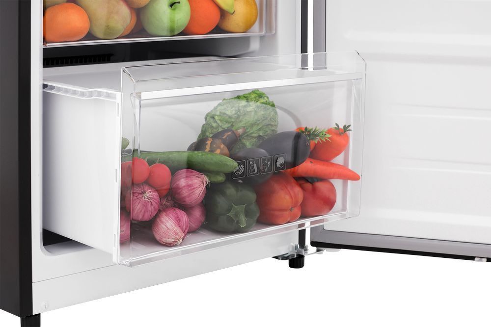 - Выдвижной ящик зоны свежести объемом 15 литров обеспечивает длительную сохранность продуктов и подходит для хранения грибов, зелени, овощей и фруктов.