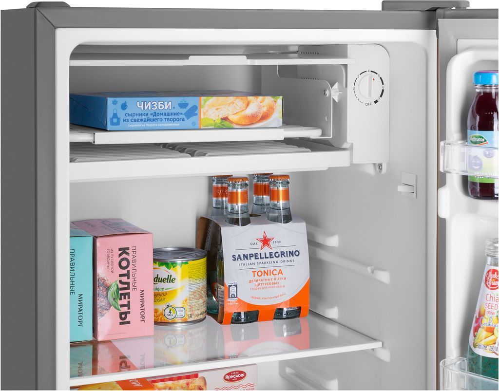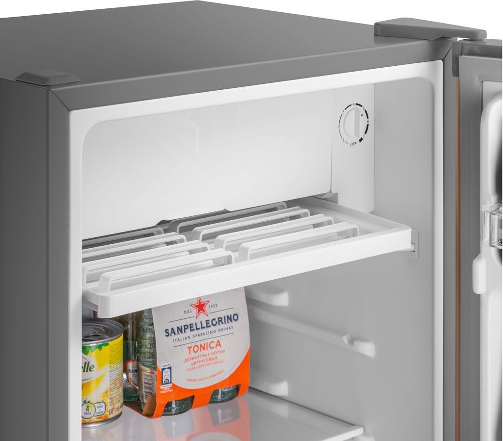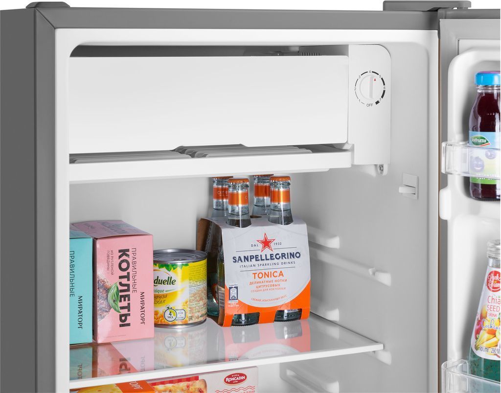 - Компактный однокамерный однодверный холодильник высотой 83 см с камерой охлаждения.