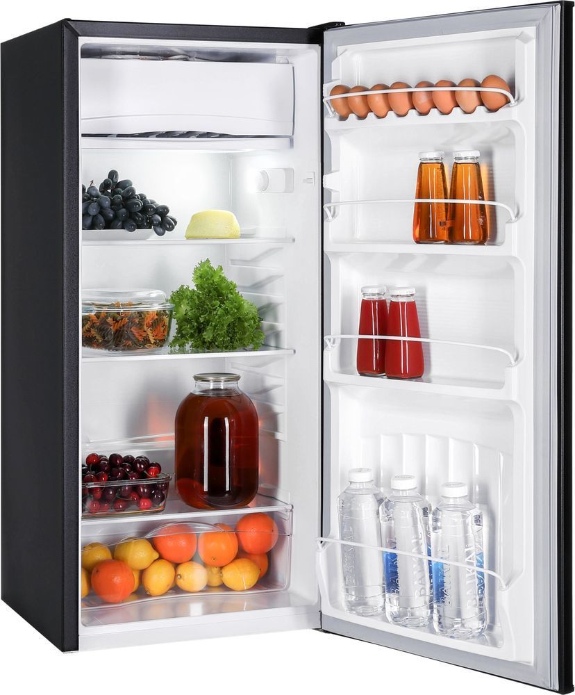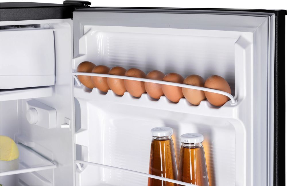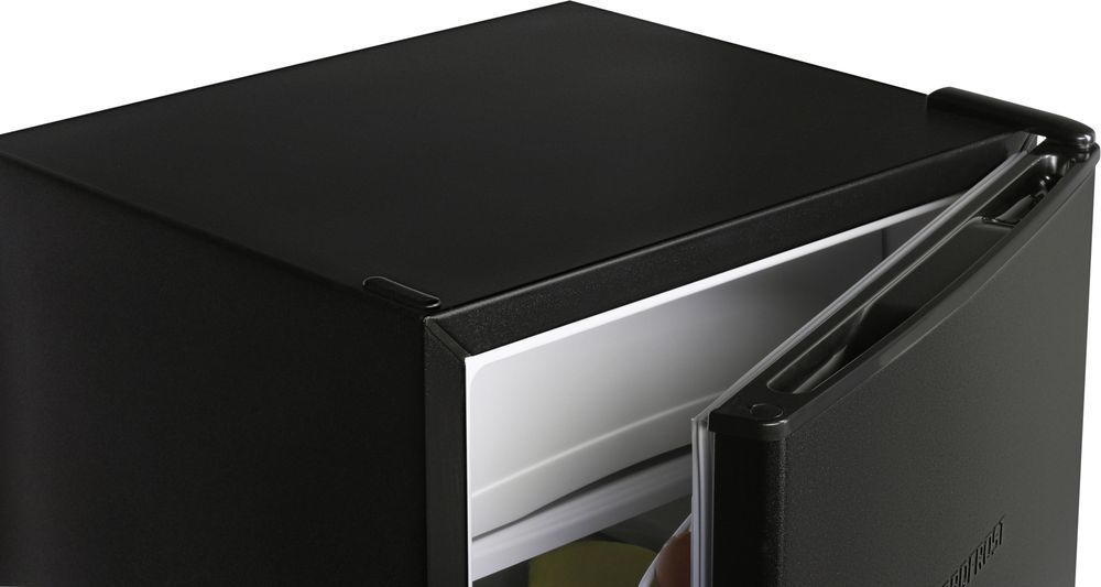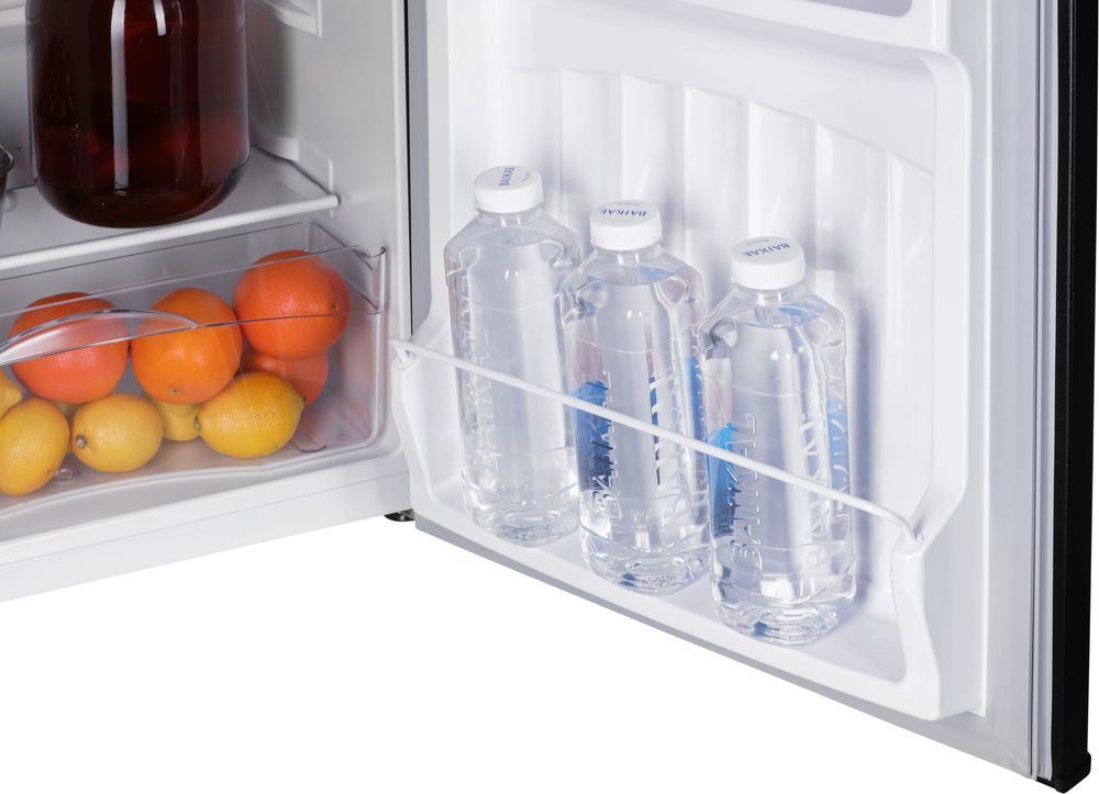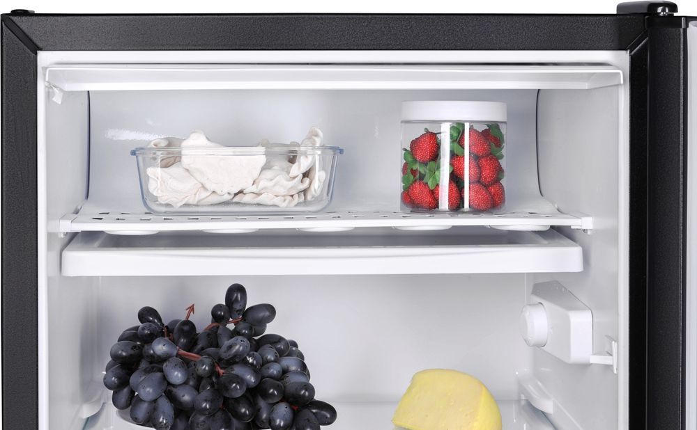 - Дверь с интегрированной горизонтальной ручкой имеет возможность перенавешивания на другую сторону для комфортного открывания и установки модели в удобном месте. Корпус холодильника выполнен в черном матовом цвете.