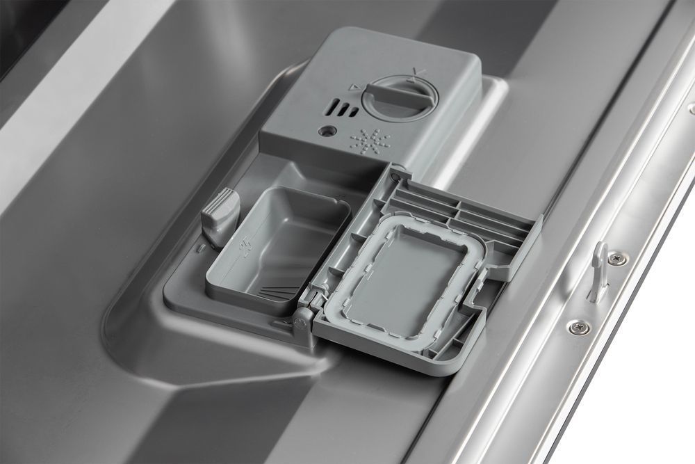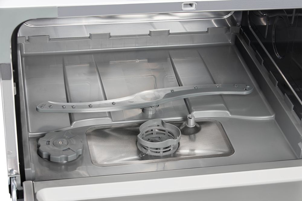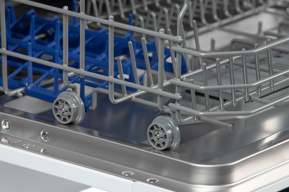 - Посудомоечная машина оснащена панелью с дисплеем и электронным управлением для легкого выбора режима. Посуда и столовые приборы размещаются в 2 специальные корзины.