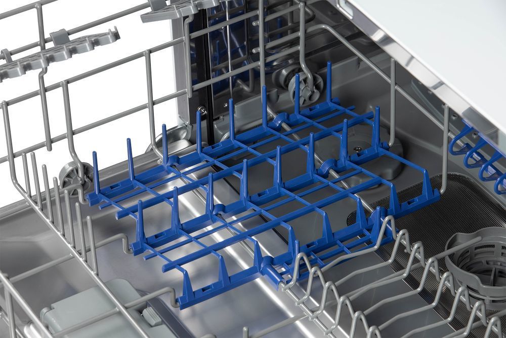 - Стандартная программа подходит для среднезагрязненной посуды, режим интенсивной мойки очистит сковороды и кастрюли от пригоревшего жира и других остатков пищи, а режим «Стекло» предназначен для хрустальной и фарфоровой посуды, корзина оборудована держателем для чашек и стаканов.
