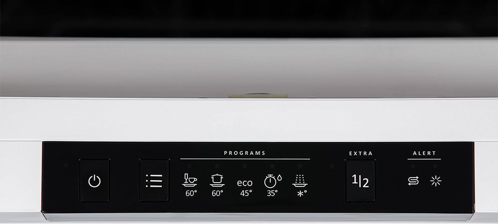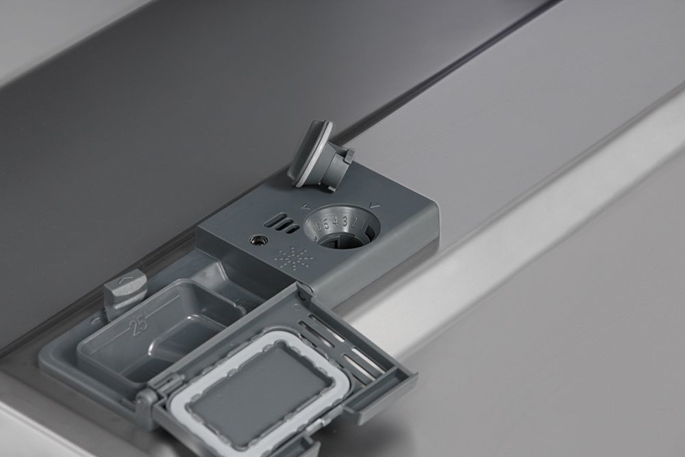 - Моющие средства загружаются в специальное отделение. Наличие ополаскивателя и соли для смягчения воды можно контролировать с помощью индикаторов на электронной панели.