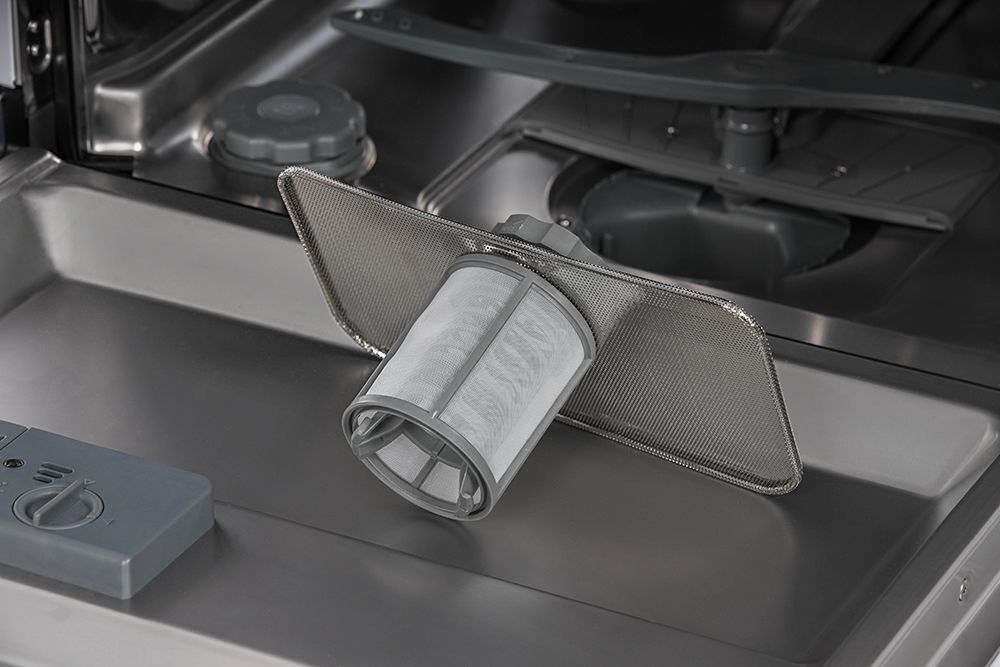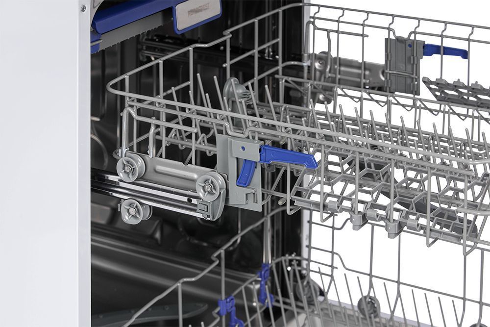 - Для удобства очистки большого количества посуды в модели есть 3 уровня загрузки: верхняя корзина, нижняя и для столовых приборов.