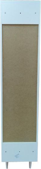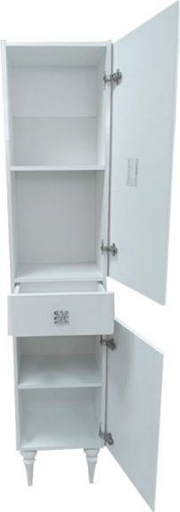 Верхняя, нижняя створки и ящик оснащены системой плавного закрывания. Фасады покрыты белой глянцевой эмалью. За каждой створкой по одной горизонтальной полке.