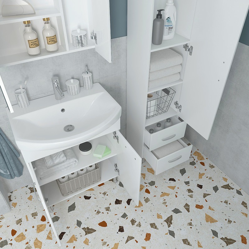 В пенале предусмотрено три полочки за распашной дверью и два ящика на направляющих полного выдвижения. Дверь пенала можно перевесить на любую нужную сторону — справа или слева. Для удобства организации хранения две полочки регулируются по высоте. Корпус выполнен из ЛДСП, фасад - из МДФ в пленке ПВХ. Универсальный пенал "Ника" входит в коллекции "Ника" в 50-75 размерах