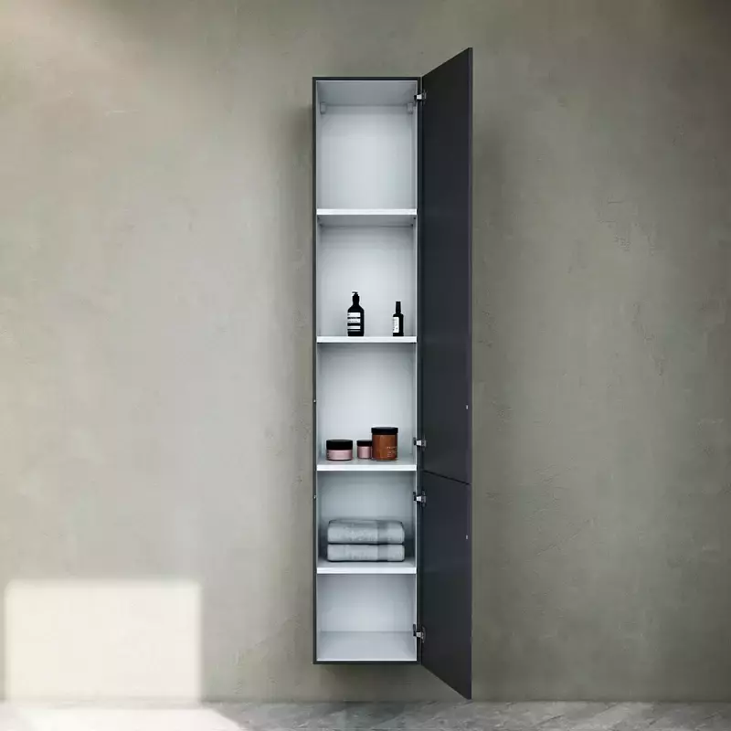 - пять полочек в шкафу-пенале оптимизируют пространство для хранения ванных принадлежностей и моющих средств;