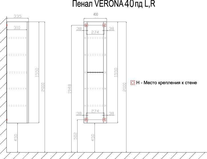 Пенал подвесной Azario Verona 40 см, универсальный, цвет белый, фурнитура серебро.