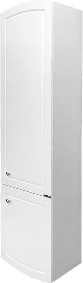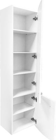 Подвесная шкаф-колонна в неоклассическом стиле. Оригинальные круглые ручки кнопки. Створки оснащены петлями с системой плавного закрывания. Фасады покрыты белой глянцевой эмалью. За верхней створкой три горизонтальные полки, за нижней одна. Шкаф-колонна выпускается с правым расположением петель.