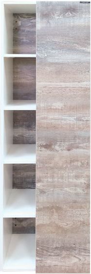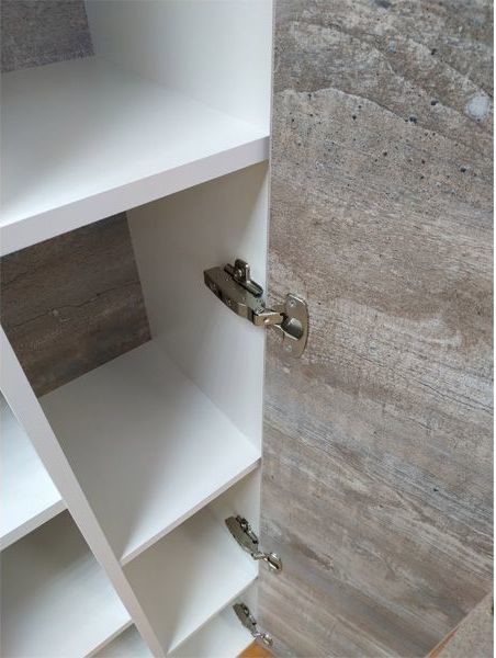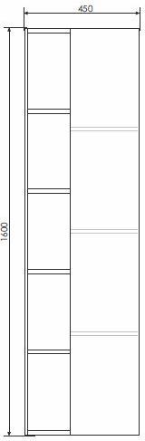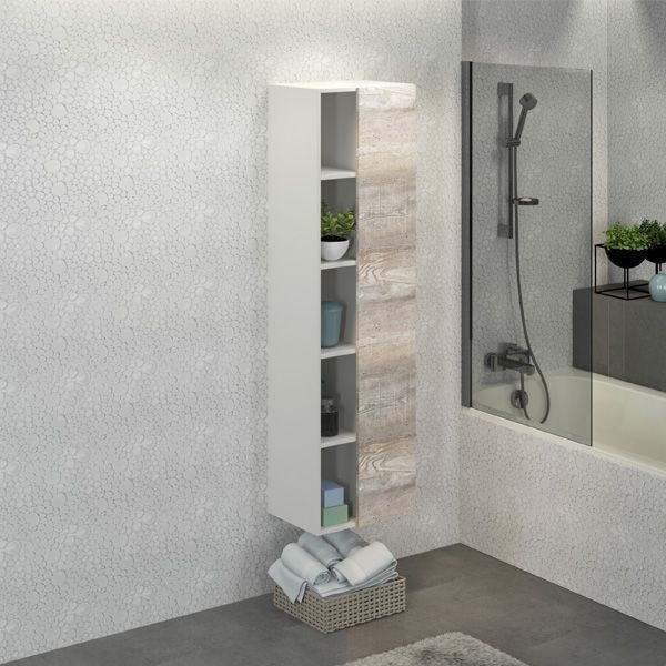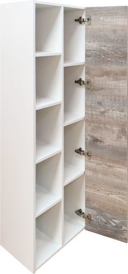 Подвесная шкаф-колонна с одной распашной дверью и пространством для открытого хранения. Створка оборудована петлями с системой плавного закрывания. За створкой три горизонтальные полки. Шкаф-колонна универсальна, может быть подвешена в правом и левом варианте.
