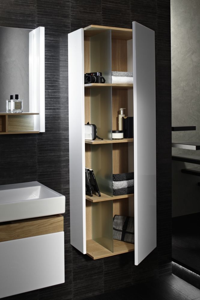 Пенал подвесной Jacob Delafon Terrace 50 см EB1179D-G1C, 1 дверца с механизмом «плавное закрывание», 2 деревянные фиксированные полочки, стеклянный разделитель, внутренние и внешние полочки, цвет белый глянцевый/светлое дерево.