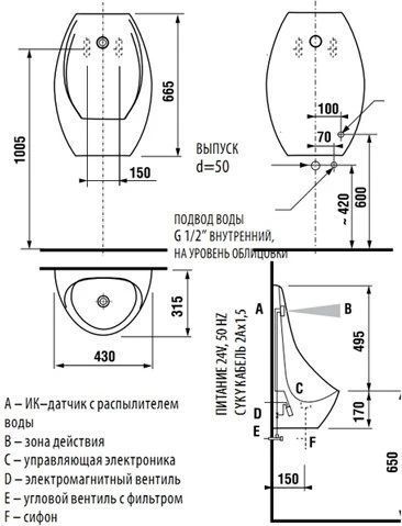 Писсуар сенсорный Jika Domino 4110.1.000.487.1, питание от сети 230V, 50 Hz, цвет белый.