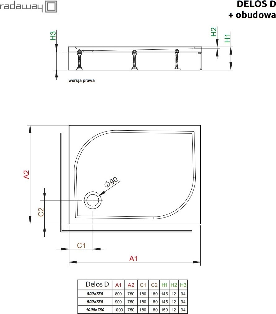 Поддон акриловый Radaway Delos D 900х750х145 мм. Цвет - белый, материал - акрил. Отверстие под сифон - 90 мм. Ножки в комплекте.