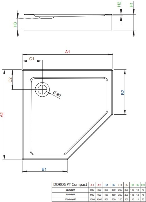 Душевой поддон Radaway Doros PT Compact 900*900*115 мм. Цвет - белый, материал - акрил. Отверстие под сифон - 90 мм. Ножки в комплекте.