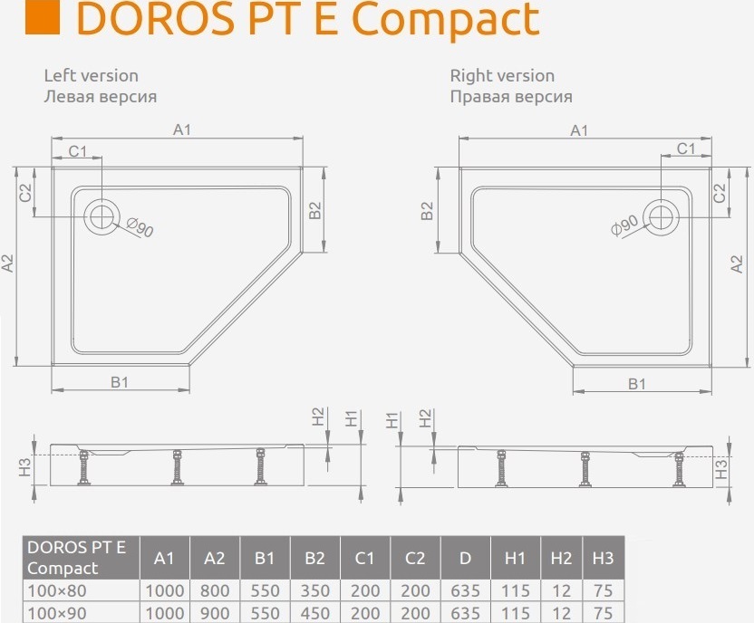 Поддон акриловый Radaway Doros PT E Compact 1000х800х115 мм. Цвет - белый, материал - акрил. Отверстие под сифон - 90 мм. Ножки в комплекте.