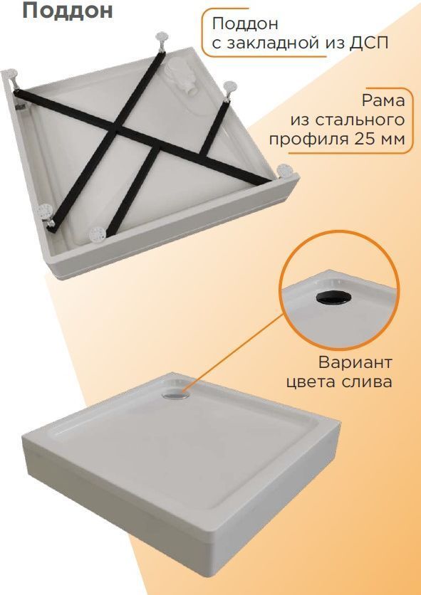 Поддон акриловый Радомир Берген SQ, размер 900х900х170 мм, диаметр слива 70 мм, цвет белый. Каркас в комплекте.