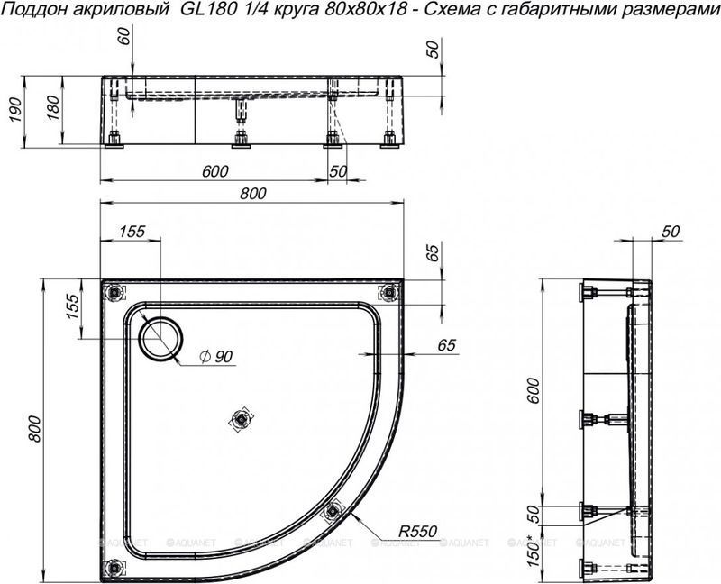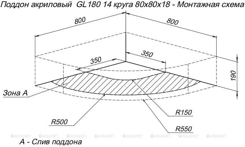 Поддон Aquanet GL180, сифон в комплекте, размер 800х800х190 мм. Цвет белый.