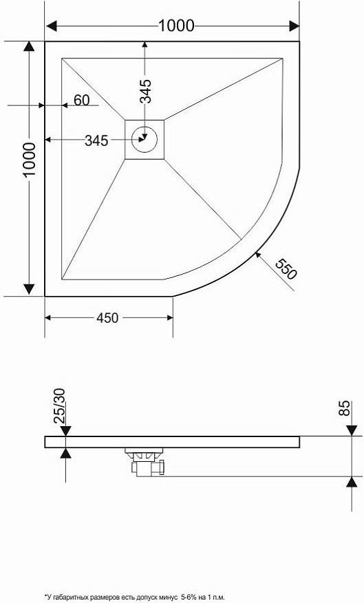 - Технический уклон поддона для стока воды (на фото изображен более выраженно для понимания направления слива воды)