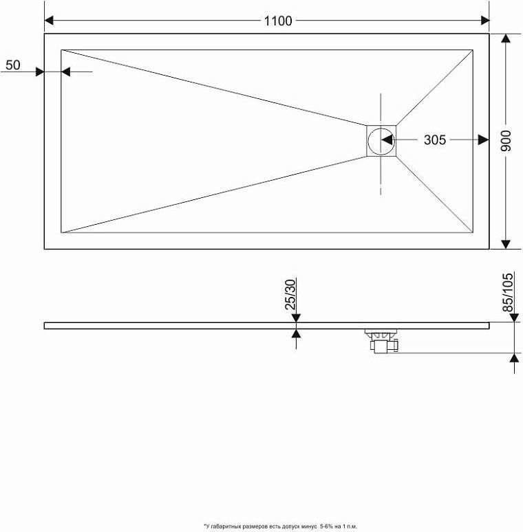 - Технический уклон поддона для стока воды (на фото изображен более выраженно для понимания направления слива воды)