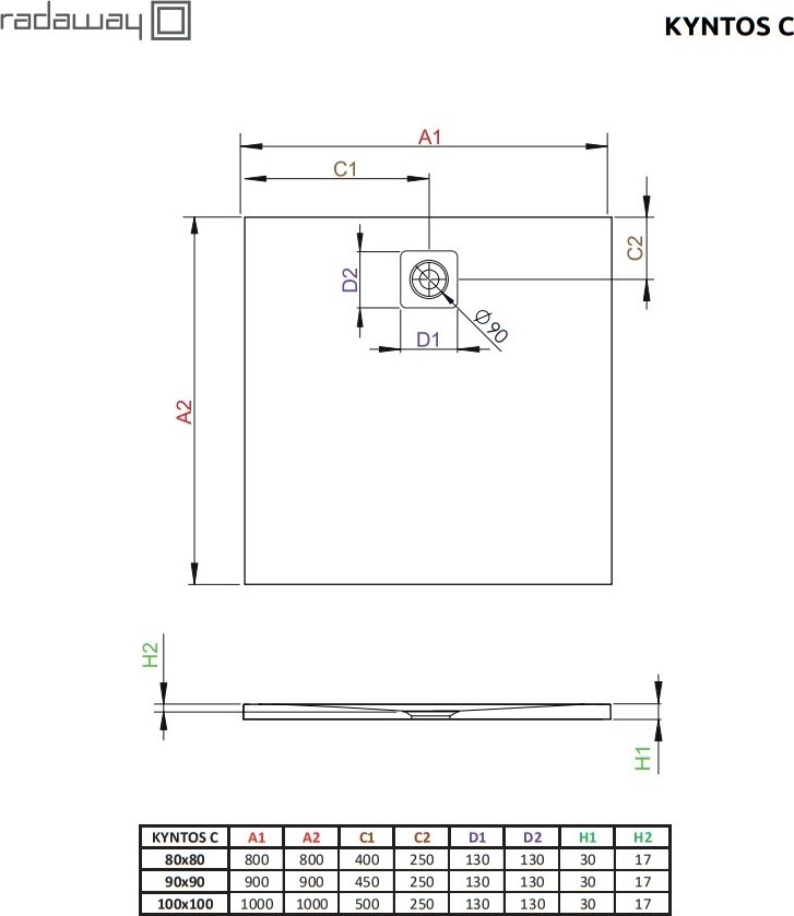 Душевой поддон Radaway Kyntos C white 1000х1000х30 мм. Цвет - белый, материал - литьевой мрамор. Отверстие под сифон - 90 мм.