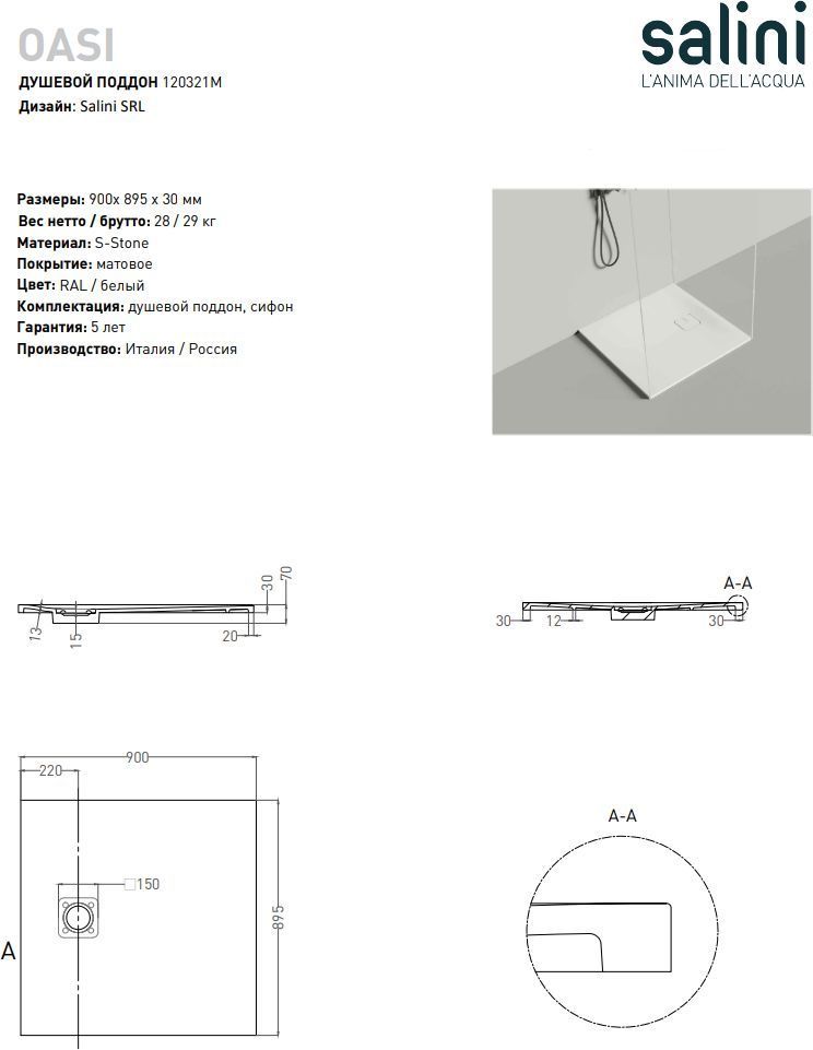 Душевой поддон каменный Salini Oasi, размер 900х900х30 мм, квадратный, цвет белый. Сифон в комплекте.