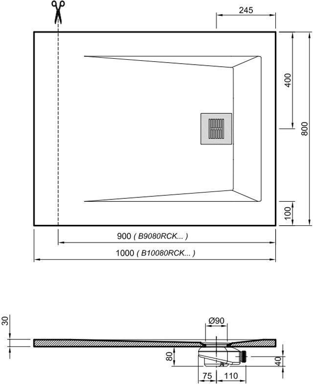 - Даже при обрезке на месте сливное отверстие ROCKS остается по центру, на продольной оси поддона, что облегчает его установку.