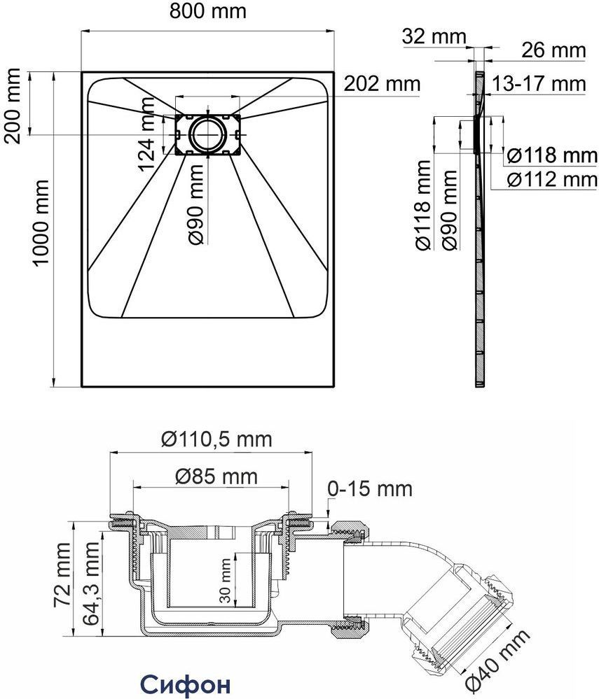 Поддон SMC WasserKraft Main, размер 1000х800х26 мм, материал SMC (стеклопластик). Сифон в комплекте 90 мм. Цвет белый.