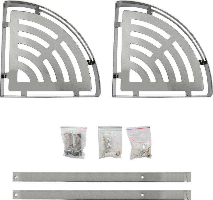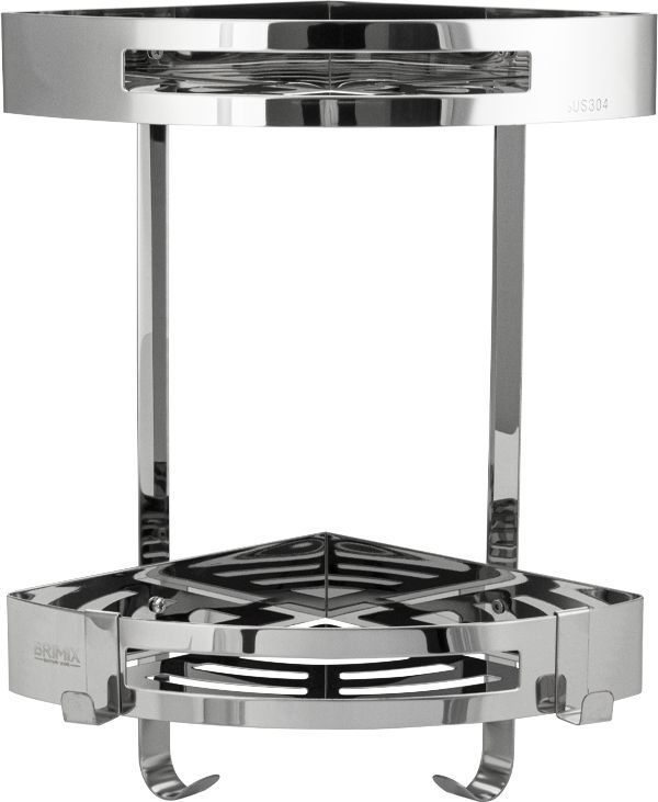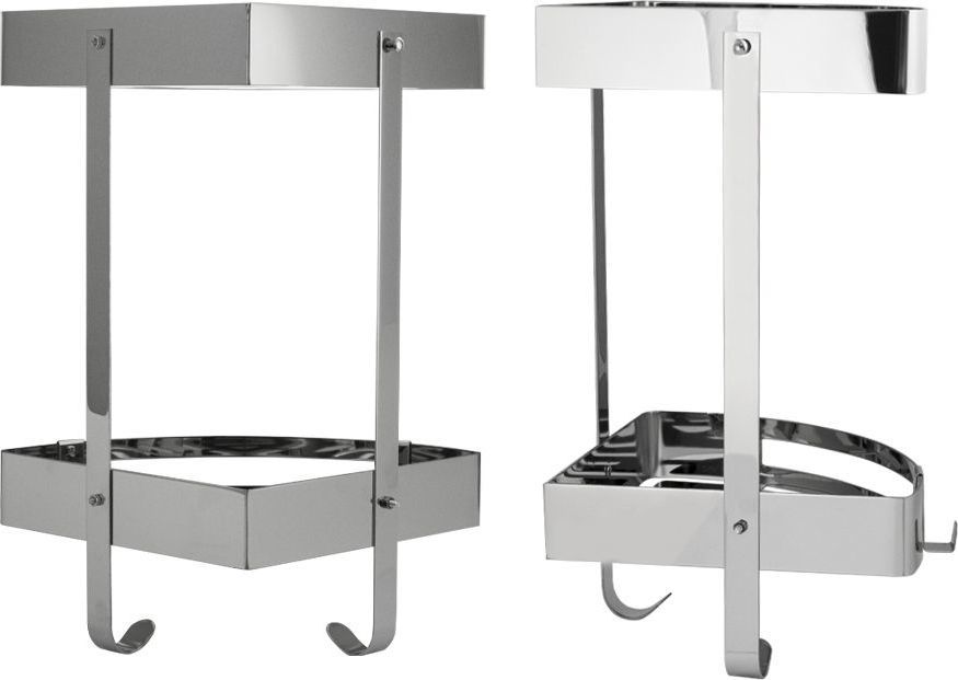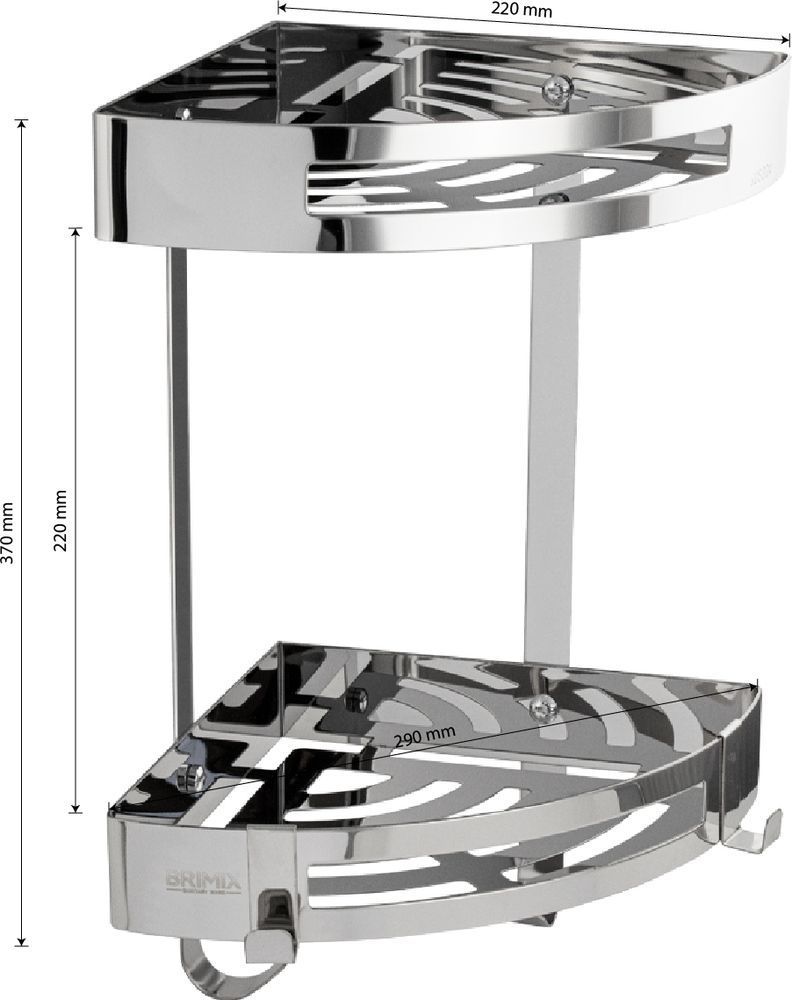 Полочка для принадлежностей, треугольная, угловая, с литым дном, двухэтажная, с двумя крючками, обладает высокими эксплуатационными характеристиками и подходит для использования дома, в общественных местах: отелях, ресторанах и пр. Изготовлена из прочной нержавеющей стали с хромоникелевым покрытием, которое придает безупречный глянцевый блеск и долговечность. Аксессуар не занимает много места, надежно фиксируется к стене при помощи набора креплений (входят в комплект) и служит удобным местом для хранения бытовых и косметических средств. Габаритные размеры: высота 370 мм, ширина 290 мм, глубина 220 мм, расстояние между полками 220 мм. Вес - 1,600 кг, объём - 0,00770 м3.
