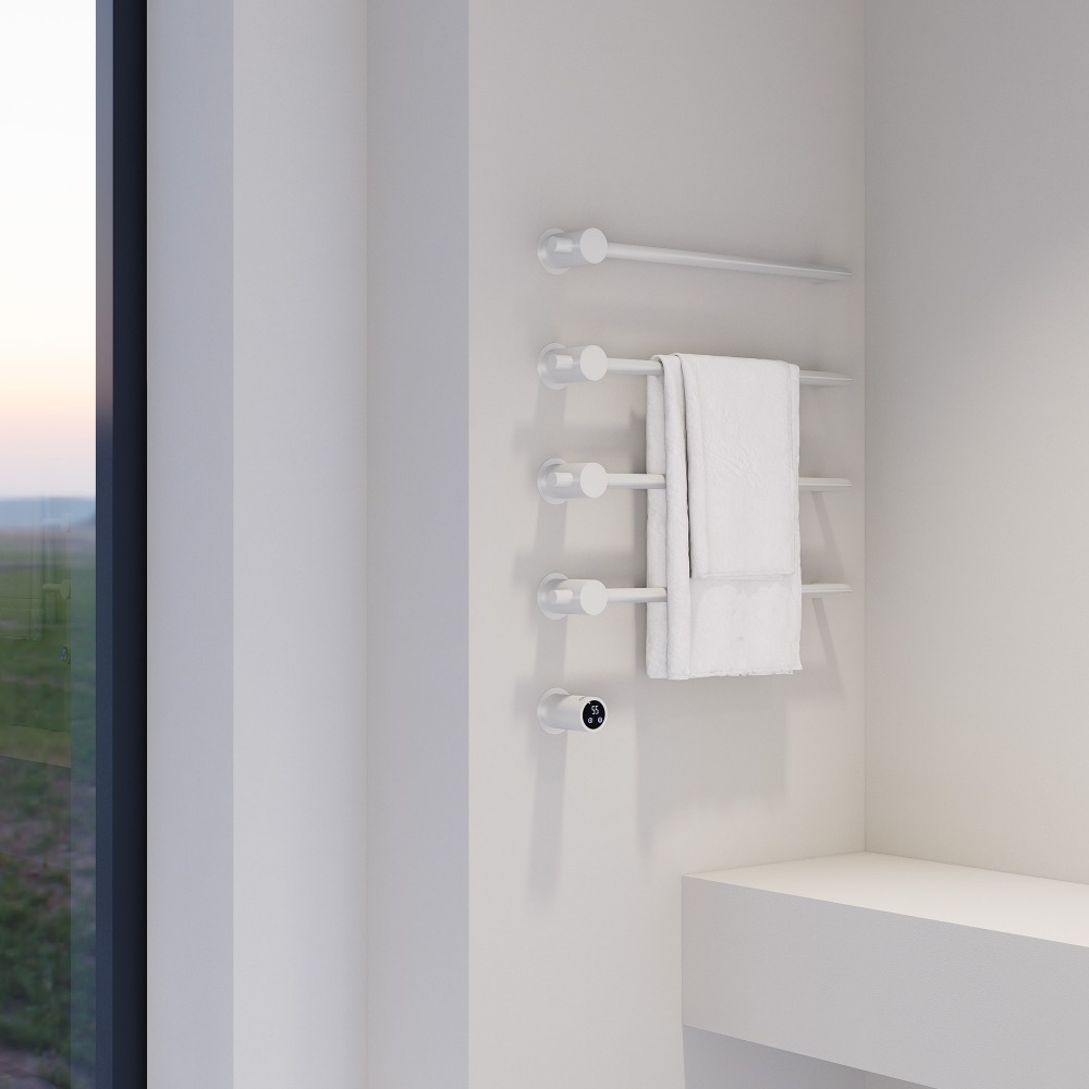 - Интеллектуальное управление. Встроенный терморегулятор и таймер дают возможность точно настраивать температуру (45−60 ∘С) и время работы полотенцесушителя (1-8 часов).