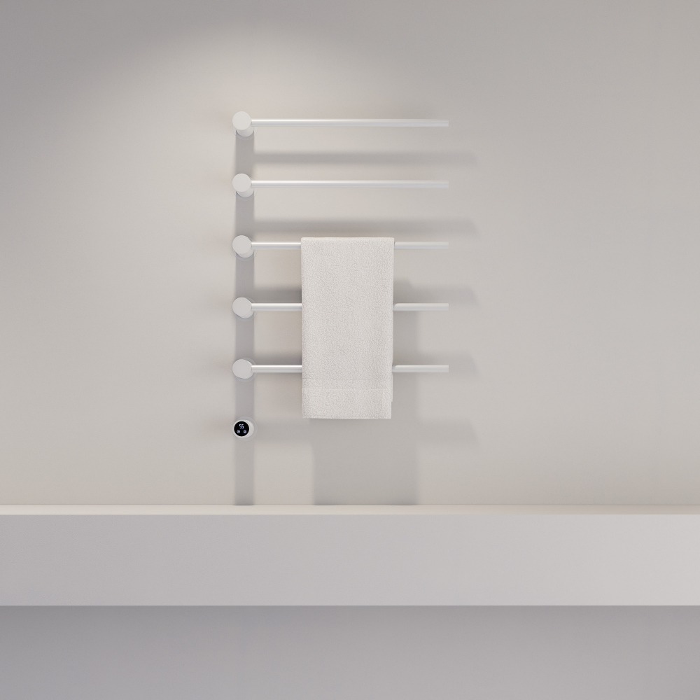 - Интеллектуальное управление. Встроенный терморегулятор и таймер дают возможность точно настраивать температуру (45−60 ∘С) и время работы полотенцесушителя (1-8 часов).