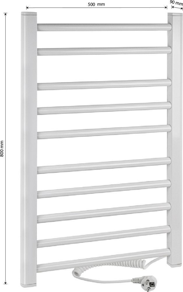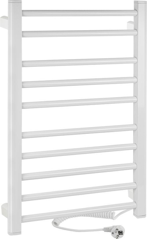 Полотенцесушитель электрический, белый, лесенка, из алюминия, тэн из углеродного волокна гармонично впишется в современный интерьер и поможет поддержать комфортную атмосферу в ванной комнате, работает вне зависимости от отопительного сезона, и его можно разместить в любом месте ванной или даже на стене в комнате. Сверху нанесено белое полимерное покрытие, устойчивое к высоким температурам. Благодаря продуманному расположению труб можно размещать объемный текстиль, сократив время просушки. Установка и ремонт не требуют работы сантехников. Габаритные размеры: высота 800 мм, ширина 500 мм, глубина 95 мм, 10 перекладин, с сухим ТЭНом, 150 W, 220-230 V, 50-60 Гц, t - 55°С, IP 44. Комплект: полотенцесушитель, крепёж, провод с евровилкой для подключения. Вес - 4,100 кг, объём - 0,03600 м3.