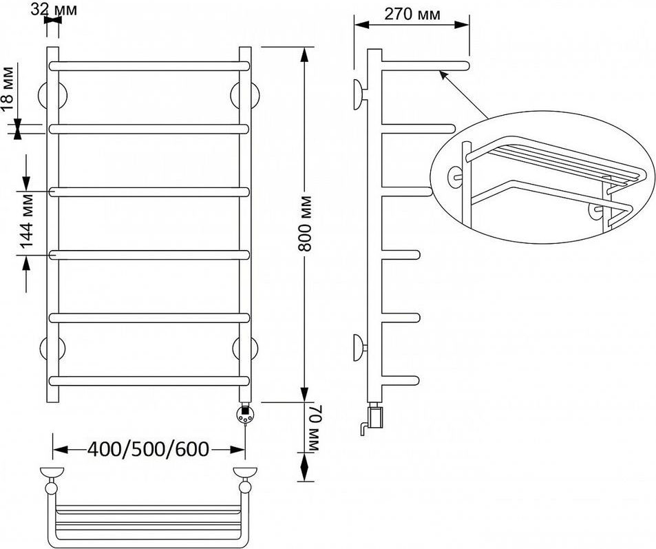 Полотенцесушитель электрический Secado Мерида 2 с полкой П6 500x800 мм (возможность скрытого подключения) бронза