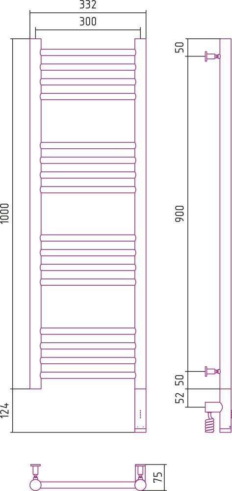 Электрический полотенцесушитель Сунержа Богема 3.0 1000х300 мм, 16 перекладин(4-4-4-4). Мощность 300 Вт, цвет чёрный матовый. Интегрированное в корпус скрытое подключение.