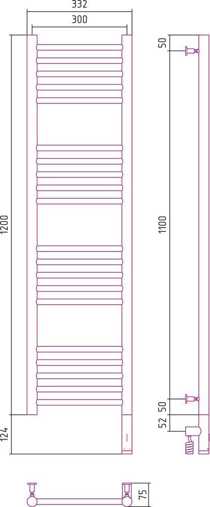 Электрический полотенцесушитель Сунержа Богема 3.0 1200х600 мм, 16 перекладин(4-4-4-4). Мощность 300 Вт, цвет чёрный матовый. Интегрированное в корпус скрытое подключение.