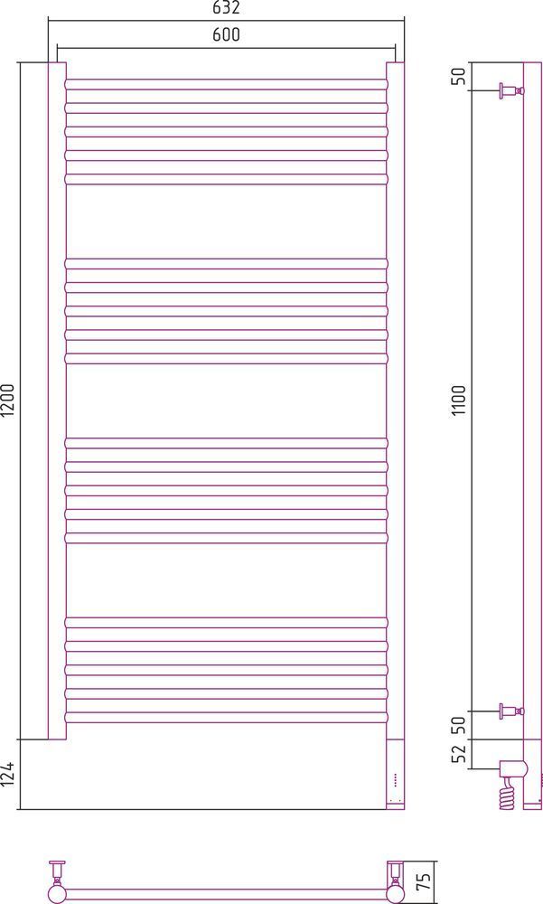 Полотенцесушитель электрический Сунержа Богема 3.0 П20 1200x600 мм (прямая перемычка) 31-5805-1260 R, чёрный матовый