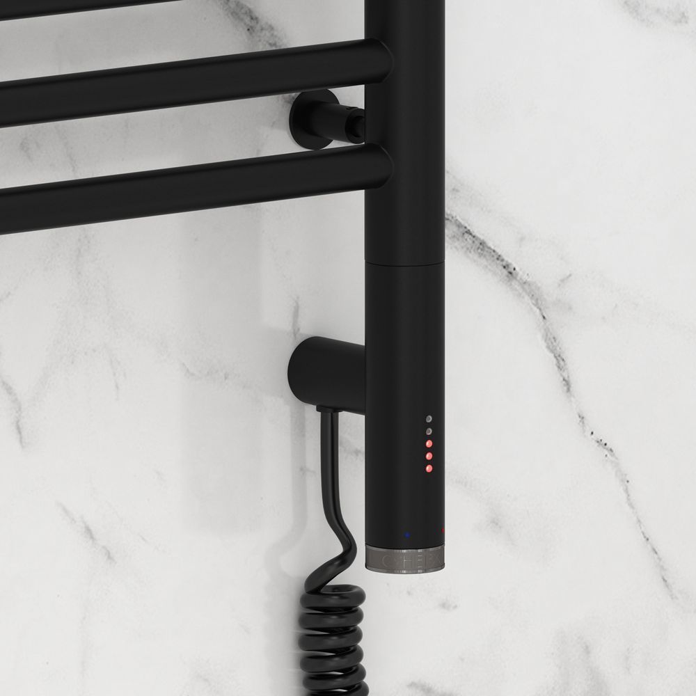 Электрический полотенцесушитель Сунержа Богема 3.0 500х400 мм, 9 перекладин(4-5). Мощность 300 Вт, цвет чёрный матовый. Интегрированное в корпус скрытое подключение.