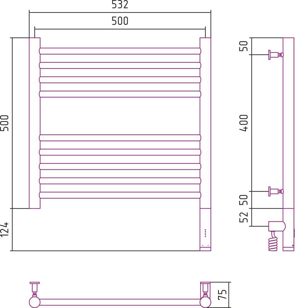 Электрический полотенцесушитель Сунержа Богема 3.0 500х500 мм, 9 перекладин(4-5). Мощность 300 Вт, цвет сатин. Интегрированное в корпус скрытое подключение.