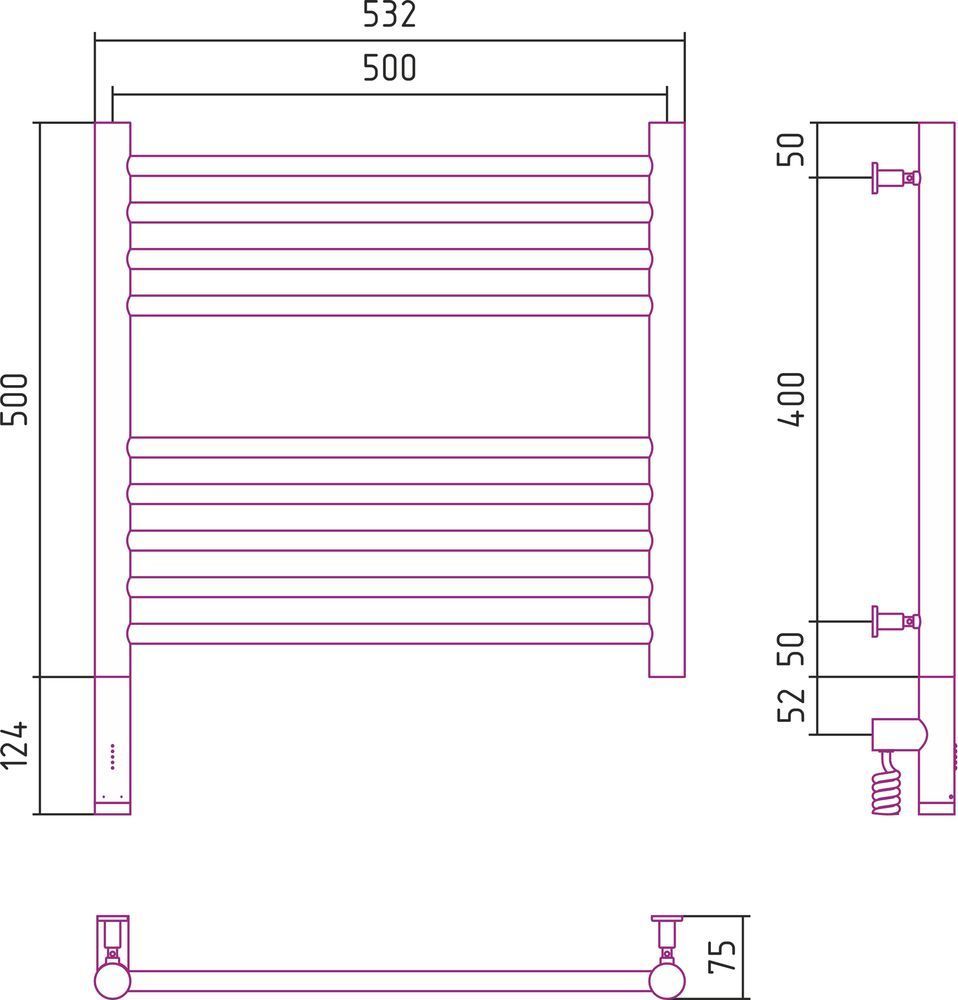 Электрический полотенцесушитель Сунержа Богема 3.0 500х500 мм, 9 перекладин(4-5). Мощность 300 Вт, цвет чёрный матовый. Интегрированное в корпус скрытое подключение.