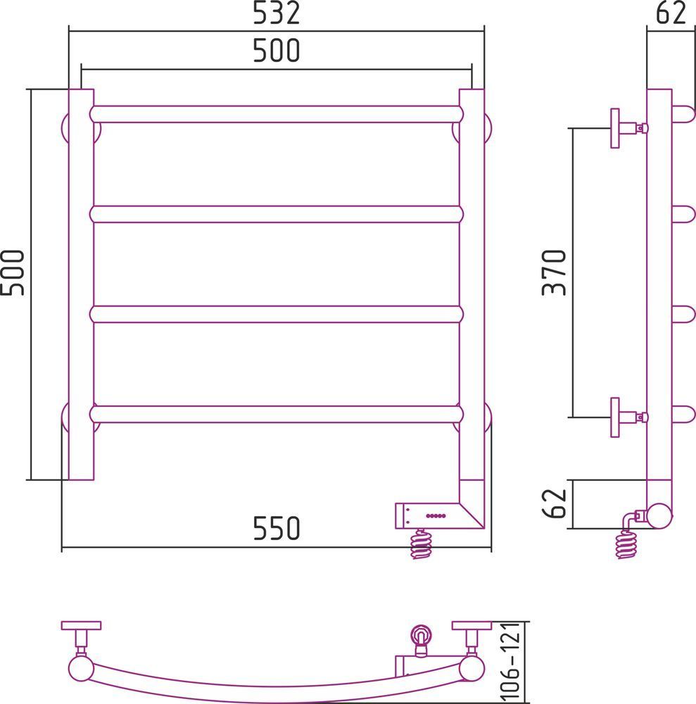 Электрический полотенцесушитель Сунержа Галант 2.0 500x500 мм, 4 перекладины. Мощность 300 Вт, цвет белый. Возможна установка модуля скрытого подключения.