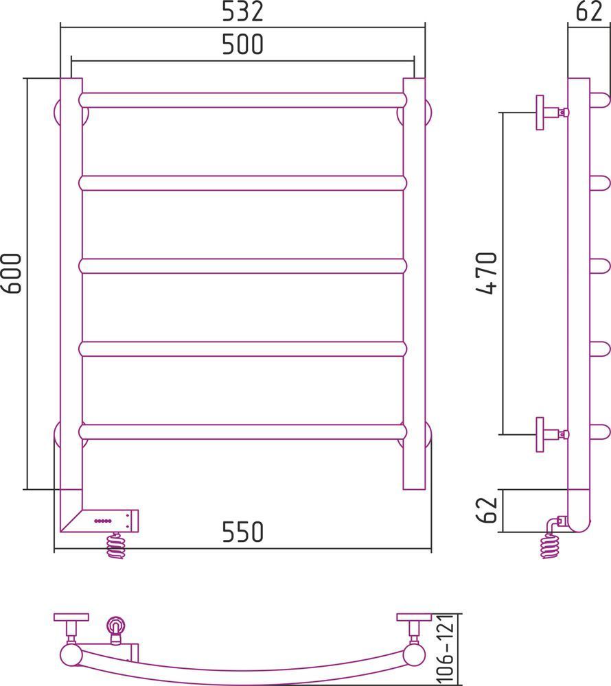 Электрический полотенцесушитель Сунержа Галант 2.0 600x500 мм, 5 перекладин. Мощность 300 Вт, цвет чёрный матовый. Возможна установка модуля скрытого подключения.
