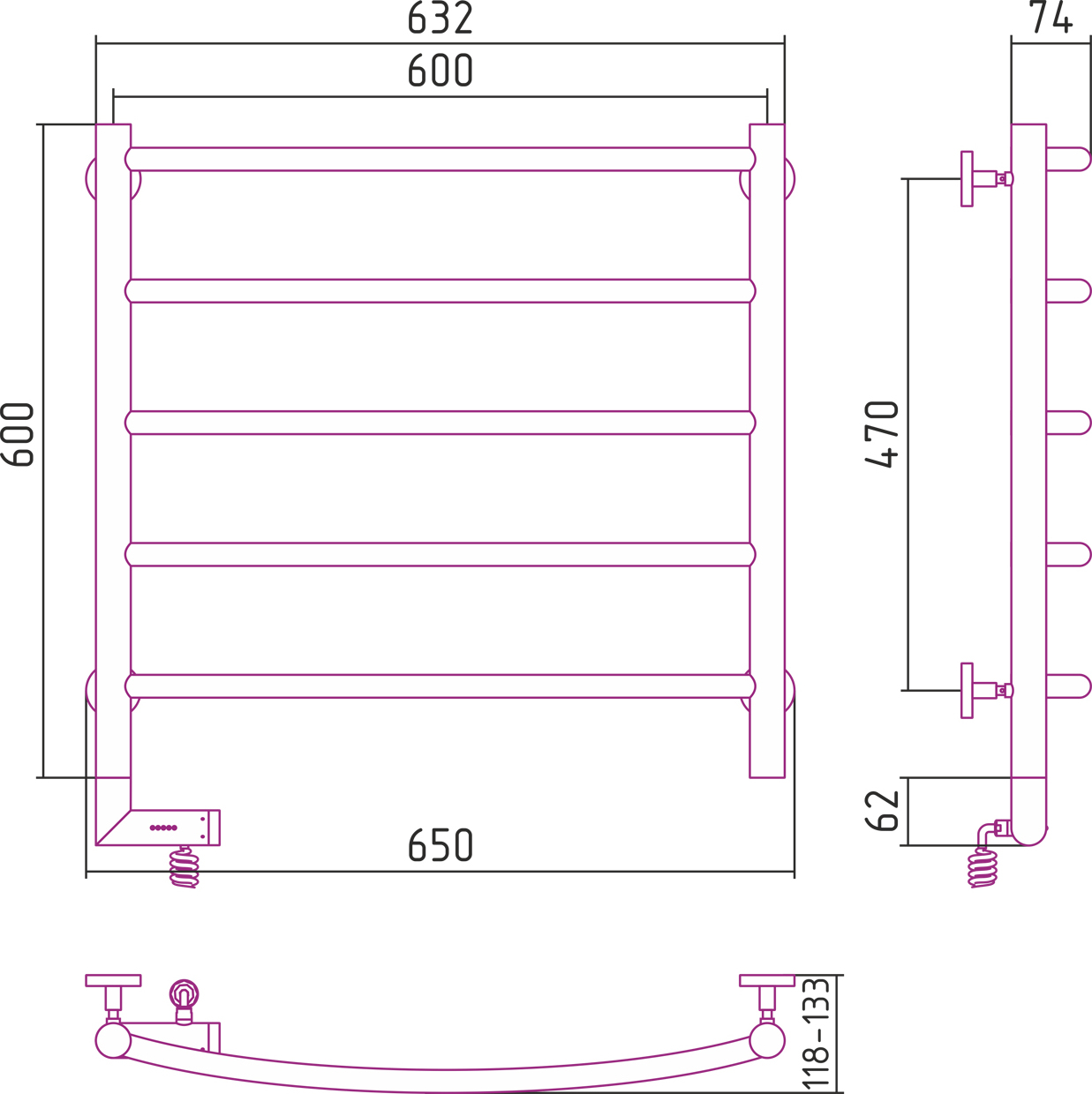 Электрический полотенцесушитель Сунержа Галант 2.0 600x600 мм, 5 перекладин. Мощность 300 Вт. Возможна установка модуля скрытого подключения.