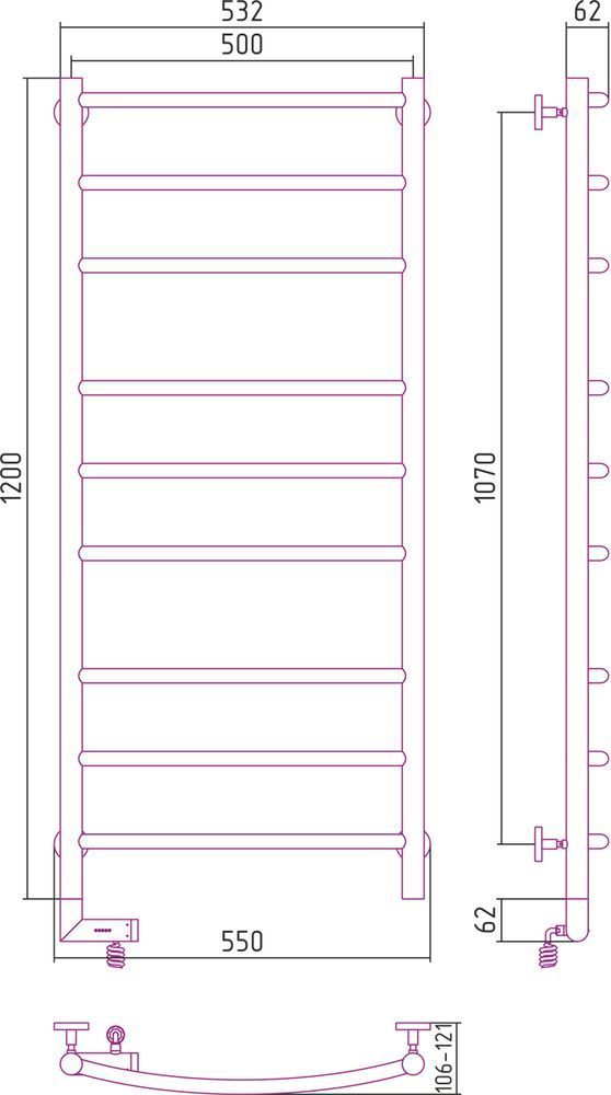 Электрический полотенцесушитель Сунержа Галант 2.0 1200x500 мм, 9 перекладин. Мощность 300 Вт, цвет чёрный матовый. Возможна установка модуля скрытого подключения.