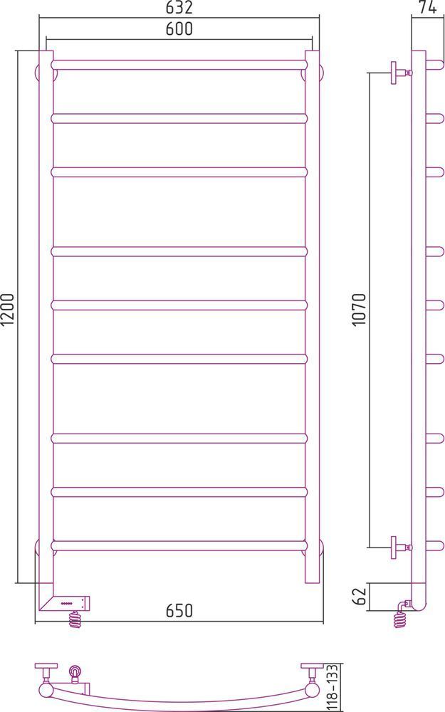 Электрический полотенцесушитель Сунержа Галант 2.0 1200x600 мм, 9 перекладин. Мощность 300 Вт, цвет чёрный матовый. Возможна установка модуля скрытого подключения.