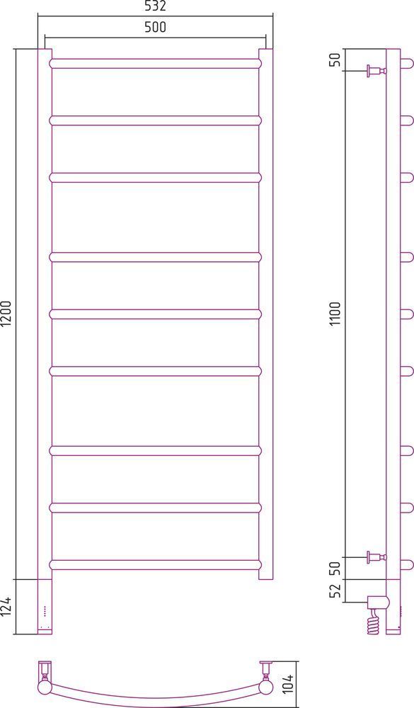 Полотенцесушитель электрический Сунержа Галант 3.0, размер 1200х500 мм, 3+3+3 перекладины. Мощность 300 Вт. Скрытое подключение.