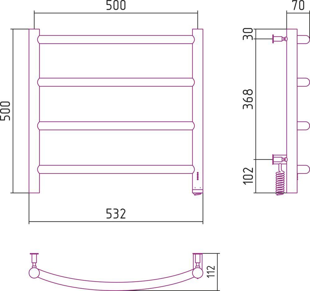 Полотенцесушитель электрический Сунержа Галант 4.0, размер 500х532 мм, 4 перекладины. Мощность 72 Вт, цвет белый. Интегрированное в корпус скрытое подключение.